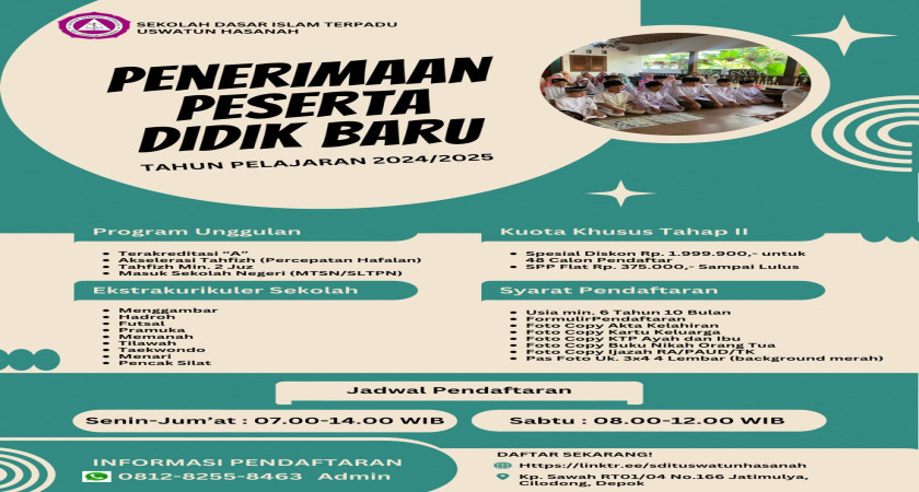 Telah dibuka Penerimaan Peserta Didik Baru atau PPDB SDIT Uswatun Hasanah telah dibuka, yuk daftarkan putra-putri anda di sekolah kami